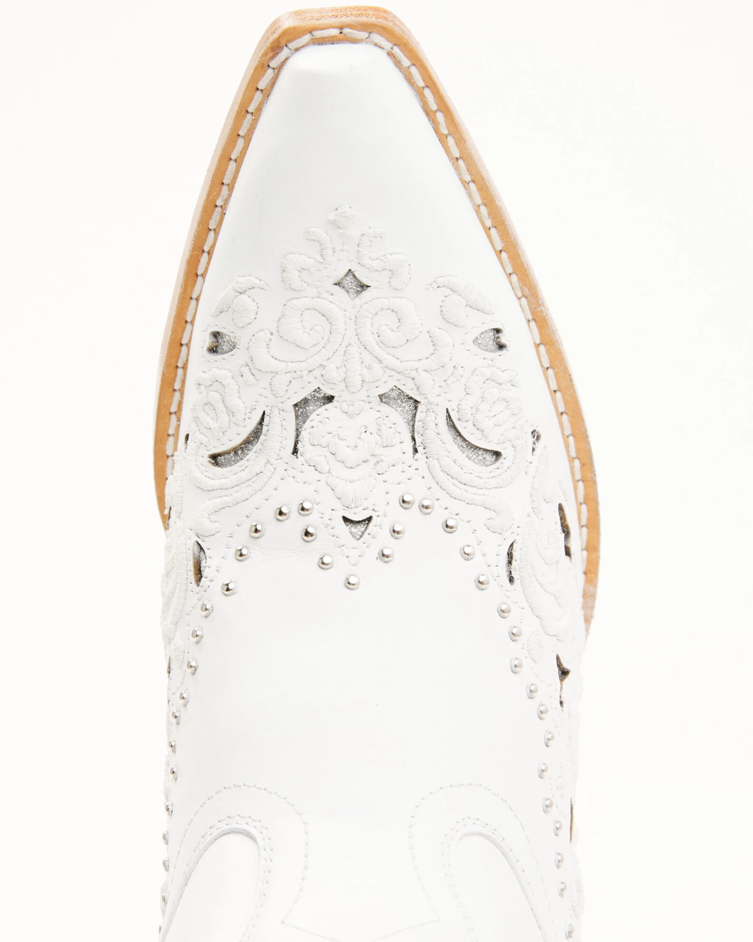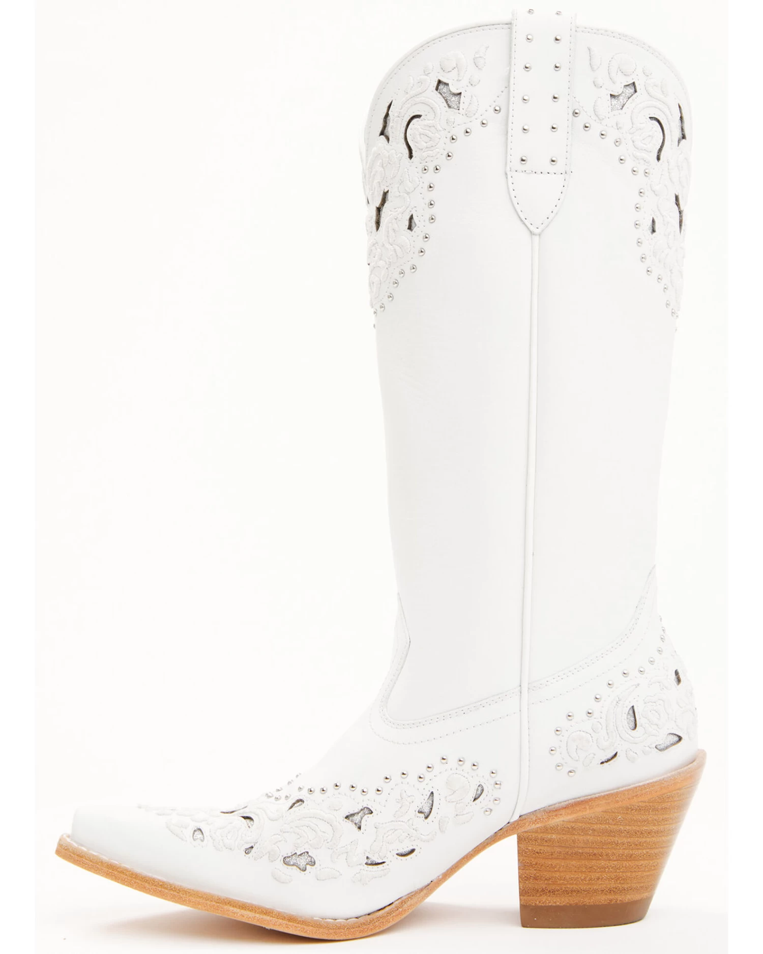 - Filigree embroidery with inlay and studded design on vamp and top of shaft